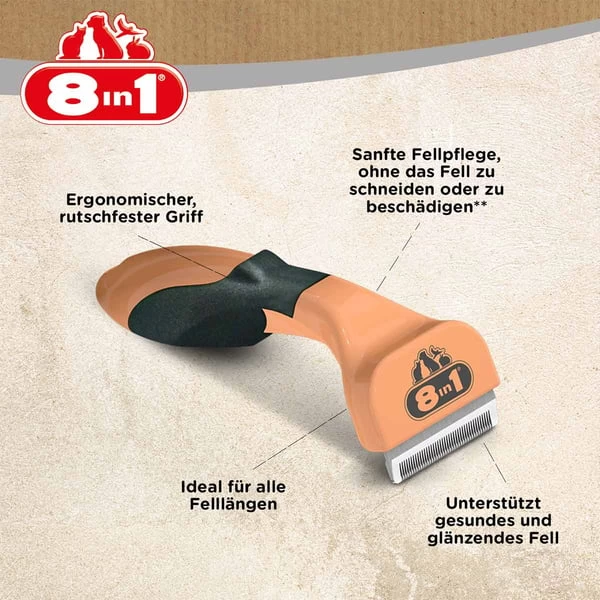 Beste Ergebnisse werden erzielt, wenn du dein Haustier 1 bis 2 Mal pro Woche jeweils 10-20 Minuten lang bürstest. Insbesondere im Frühjahr und im Herbst erleichtert eine regelmäßige Anwendung den Fellwechsel. Bevor du die 8in1 Unterfellbürste verwendest, kämmst du dein Haustier, um Knoten oder Verfilzungen im Fell zu entfernen und die Haut des Haustieres auf Wunden zu untersuchen.