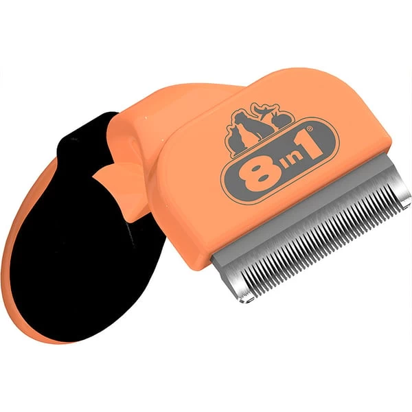 Mit der orangen Bürste von 8in1 entfernst du lose Haare, Schmutz und Schuppen unkompliziert aus dem Fell deiner Katze. Dank des verwendeten Kunststoffs ist das Fellpflegeprodukt sehr leicht und formbeständig.