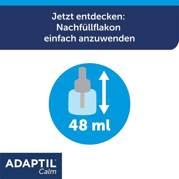 Der 1 Monats-Nachfüllflakon 48 ml von Adaptil ergänzt die neuen Steckdosen-Verdampfer und trägt dank seiner Vorteilsgröße für einen weiteren Monat dazu bei, dass Ihr Vierbeiner sichtlich entspannter und gelassener ist – die Wirkung von Adaptil ist wissenschaftlich bewiesen! Grund für die Wirkung des „Raumduftes“ ist der im Nachfüllflakon enthaltene natürliche Geruchsstoff-Mix, der der Natur nachempfunden ist. Eine sehr ähnliche Pheromonart wird von der Mutterhündin ausgestoßen, nachdem die Welpen geboren sind. Durch diese Geruchsstoffe entspannen sich die jungen Hunde und können so einfacher mit neuen Eindrücken und Situationen umgehen.