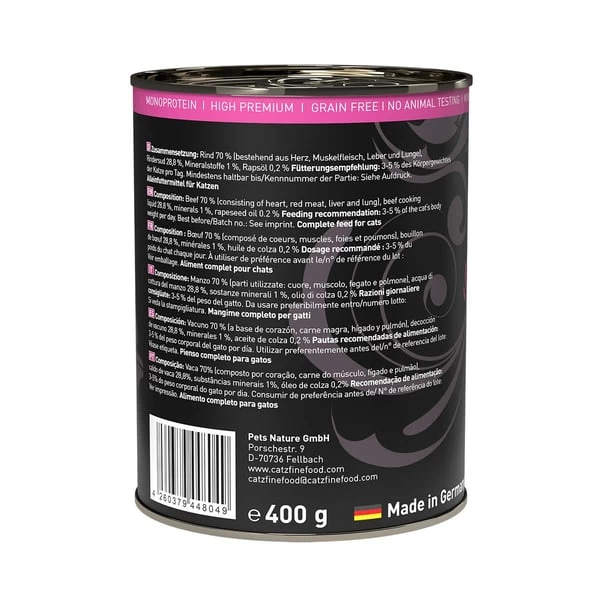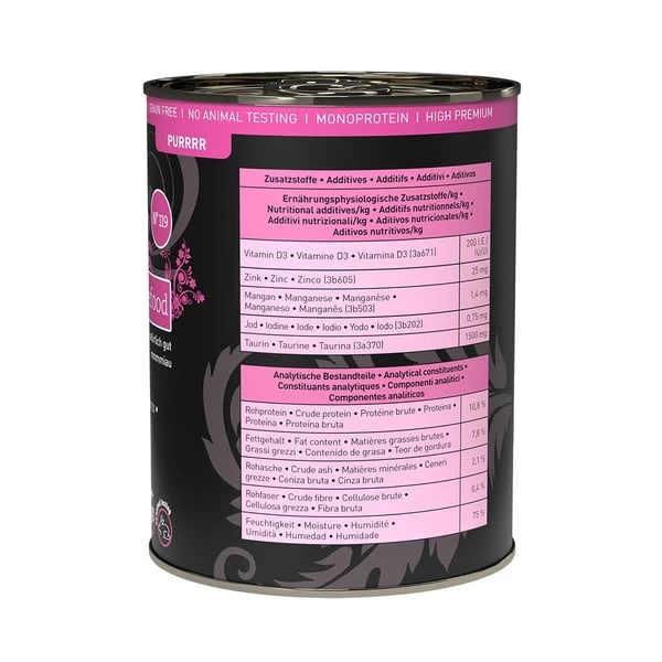 Vorbild für catz finefood ist die Natur. Catz finefood entwickelt die Rezepturen nach dem Beutetierkonzept. Weil Katzen Fleischfresser sind, sollen sie auch Fleisch bekommen! Deshalb enthält catz finefood Purrrr über 98 % frisches Fleisch/Fisch/Innereien und Kochsud, ergänzt mit wertvollen Ölen und wichtigen Mineralstoffen. Es wird bewusst auf die Zugabe von Zucker, Geschmacksverstärkern, Farb- sowie Füllstoffen verzichtet – das hat catz finefood gar nicht nötig. Denn die naturbelassenen Zutaten enthalten die besten Nährstoffe; deshalb kommen Formfleisch oder Fleischmehl nicht in die Dose (oder in den Pouchbeutel)! Wichtig ist eben auch, was NICHT drin ist.