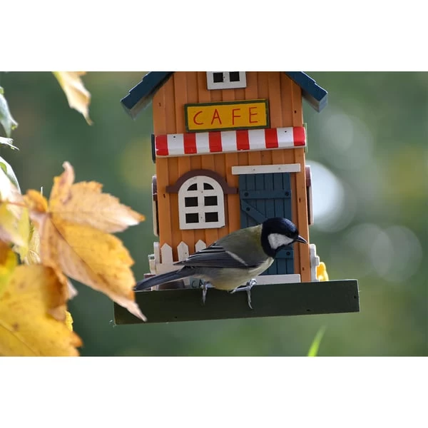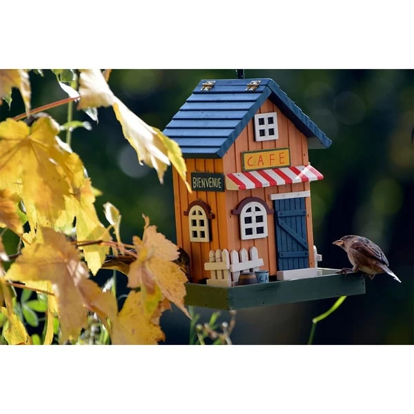 Das sehr aufgeweckte bunte Vogelhaus im Design „Café“ wurde aus Monterey-Kiefer hergestellt. Zudem ist farbig lasiert und hält somit der nassen und kalten Jahreszeit stand. Das Dach kann geöffnet werden, wodurch das Futtersilo problemlos befüllt werden kann. Mit der angebrachten Kordel es einfach aufgehangen werden.