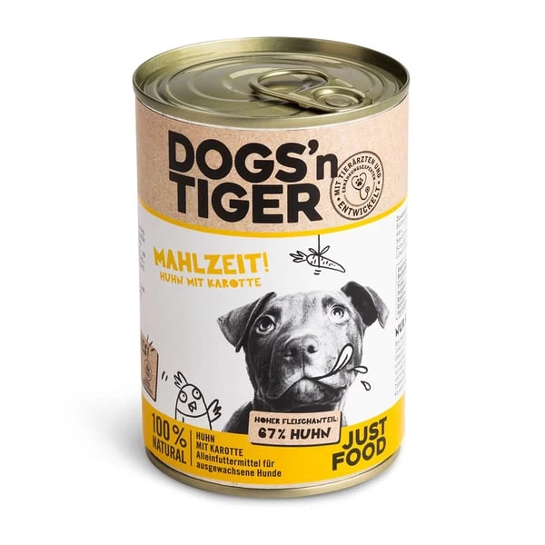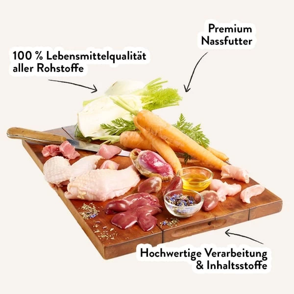67% bestehend aus Hühnerherzen, Hühnerfleisch, Hühnerlebern, Hühnermägen, Hühnerhälsen, 27,3% Brühe, 4% Karotten, 1% Mineralstoffe, 0,5% bestehend aus Fenchel, Ringelblume, Brennnesselkraut, Schafgarbenkraut, Löwenzahnkraut, Spitzwegerichblatt, Löwenzahnwurzel, Johanniskraut, 0,2% Leinöl