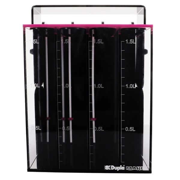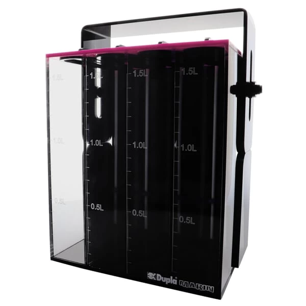 Praktischer Behälter zur Aufnahme von 4 Dosierlösungen. Die einzelnen Kammern, weisen jeweils 1,5 Liter Fassungsvermögen auf und dienen zugleich zur Kontrolle der Füllstände. So können die einzelnen Kammern zum Beispiel mit den Dupla Marin Spurenelementen wie KH+ liquid, Magnesium liquid, Calcium liquid oder dem Spurenelemntemix liquid gefüllt werden. Um die einzelnen Flüssigkeiten besser unterscheiden zu können, sind vier verschiedenfarbige Silikonschläuche (Blau, Grau, Magenta und Schwarz) im Set enthalten sowie farbige Etiketten mit der passenden Bezeichnung.