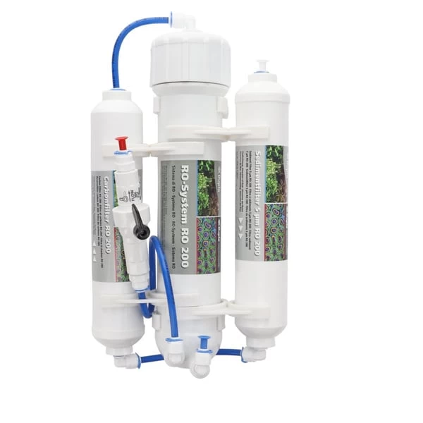 RO 200 komplett montiert mit Sedimetfilter (5µm Feinfilter), Carbonfilter und Membrane, 3x2m Schlauch, 3/4 Zoll Wasserhahnanschluss, Durchflussmengenbegrenzer mit integriertem Spülventil, Verbindungsklammern für Vorfilter- und Membrangehäuse, Wandhalterung, Schlauchstopfen, Gehäuseschlüssel für Membrangehäuse, Bedienungsanleitung