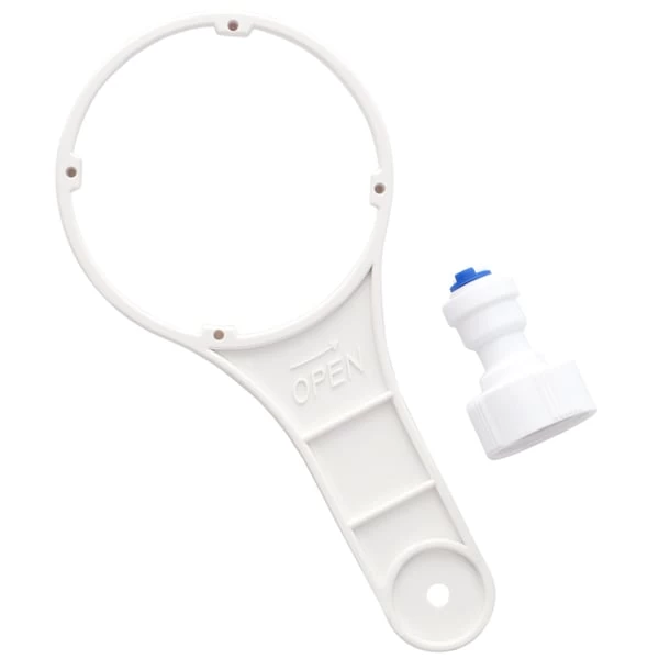 RO 300 komplett montiert mit Sedimentfilter (5µm Feinfilter), Carbonfilter und Membrane, 3x2m Schlauch, 3/4 Zoll Wasserhahnanschluss, Durchflussmengenbegrenzer mit integriertem Spülventil, Wandhalterung, Schlauchstopfen, Gehäuseschlüssel für Filter- und Membrangehäuse, Bedienungsanleitung