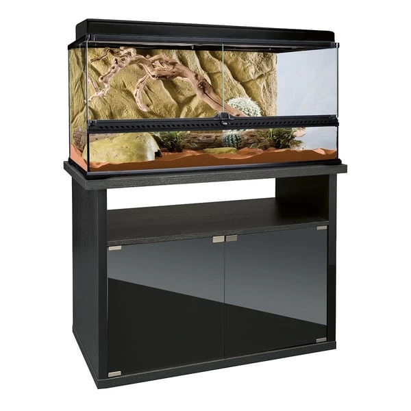 Neben dem Terrarium ist eine praktische Abdeckung Teil des Gesamtpakets, die Raum für mehrere Leuchtstoff- und Glühlampen mit bis zu 26 W bietet. Abgerundet wird alles von einem schicken, schwarzen Unterschrank, der mit Glastür und Magnetverschlüssen ebenso punktet wie mit sicherem Stand und ausreichend Stauraum.