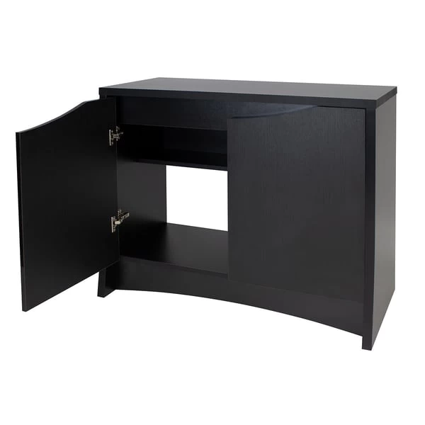Der integrierte Regalboden bietet Aufbewahrungsraum für Futter, Reinigungsutensilien und Zubehör. Der Schrank Deluxe verfügt über Schwingtüren ohne Griffe. Die Halboffene Rückwand ermöglicht eine ordentliche Kabelanordnung.