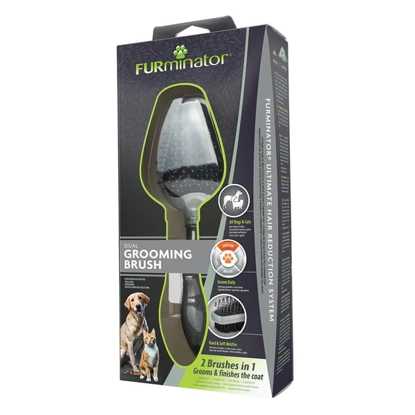 Die FURminator Doppelbürste ist eine 2-in-1-Bürste, die das Fell sowohl pflegt als auch glänzend macht.