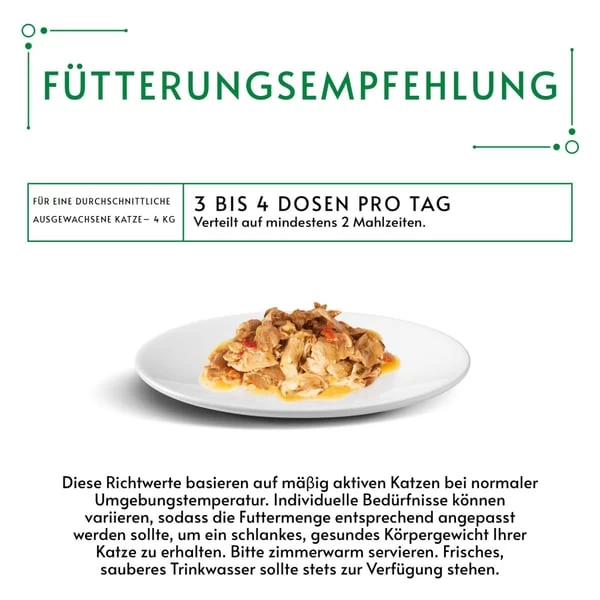 Vitamin A 880 IE/kg, Vitamin D3 134 IE/kg, Eisen-(II)-sulfat Monohydrat (Fe) 10 mg/kg, Calciumjodat, wasserfrei (I) 0,25 mg/kg, Kupfer-(II)-sulfat Pentahydrat (Cu) 0,8 mg/kg, Mangansulfat Monohydrat (Mn) 1,9 mg/kg, Zinksulfat Monohydrat (Zn) 18,2 mg/kg, Taurin 550 mg/kg