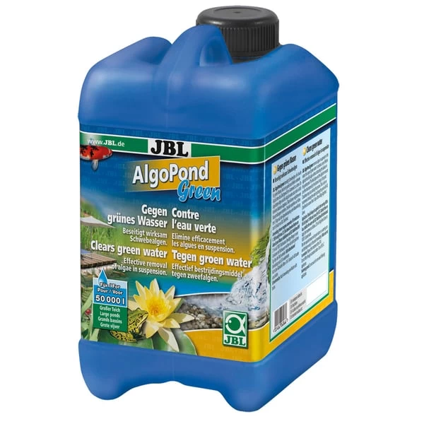 Das JBL AlgoPond Green eignet sich hervorragend zur Beseitigung von Schwebealgen in Teichen. Innerhalb weniger Tage verschwindet die grünliche Färbung des Wassers. Das Produkt von JBL ist sowohl für Fische als auch für Mikroorganismen und Pflanzen bestens verträglich. Bitte beachten Sie dazu bei der Anwendung die sachgerechte Dosierung. Die abgetöteten Algen und das Algizit werden durch die im Teich lebenden Bakterien effizient abgebaut. Eine mögliche resultierende Wassertrübung kann durch den Einsatz von JBL CleroPond ausgeglichen werden. Sie erhalten das JBL AlgoPond Green in den Varianten 250ml, 500ml und 2,5l.