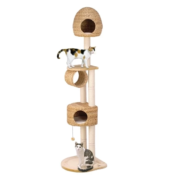 Der Plüschanteil des Kratzbaums ist samtig weich. Auch für besonders ausgiebiges Krallenschärfen ist der Kratzbaum mit dem robusten Sisal klasse geeignet. Der Kratzbaum besteht aus Echtholz – ein nachwachsender Rohstoff. Eine besonders schöne und natürliche Optik bekommt der Kratzbaum mit den verwendeten Bananenblättern. Hier kann nicht nur gespielt und gekratzt, sondern auch ein Nickerchen gemacht werden. Auch mehrere Katzen können sich dank der großen Stabilität des Kratzbaums austoben. Nicht nur ein toller Ort um die Krallen auf Vordermann zu bringen, sondern auch zum Klettern und Spielen. Besonders robust und strapazierfähig gefertigt. Mit einer Höhle für mehr Gemütlichkeit, mehreren Etagen zum Klettern, Spielelementen, einer bequemen Liegemulde zum Zusammenrollen ist der Kratzbaum wunderbar ausgestattet. Mit dem Kratzbaum von Karlie lässt du es deiner Katze gut gehen.