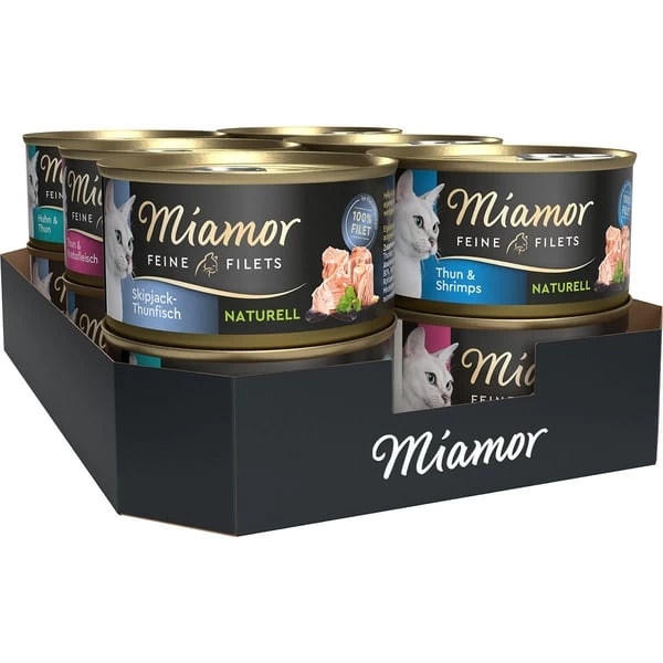 Huhn & Thun: 37% Hühnerfleisch, 27% Thunfisch, Reis. Skipjack-Thunfisch: 63% Skipjack-Thunfisch, Reis. Thun & Krebsfleisch: 56% Thunfisch, 6% Krebsfleisch, Reis. Thun & Shrimps: 59% Thunfisch, 6% Shrimps, Reis.