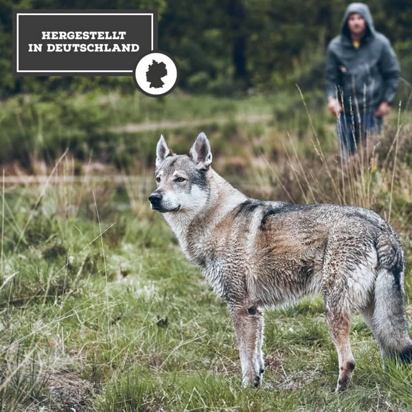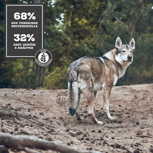 Dein Hund liebt das Abenteuer. Er ist draußen zuhause. Sein Futter ist ein wilder Streifzug durch den Wald. Viel frisches Fleisch, Gemüse, Kräuter und saftige Beeren. Ursprünglich und natürlich, genau wie das Futter des Wolfes. Deswegen lebst und fütterst du die pure Natur. Artgerecht und ganz ohne künstliche Zusätze. Weil du genau weißt, was dein Hund braucht. Ihr seid Freunde im Geiste.