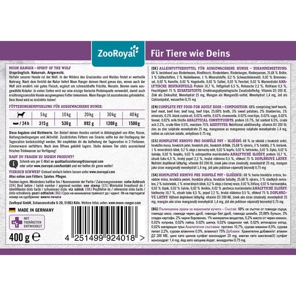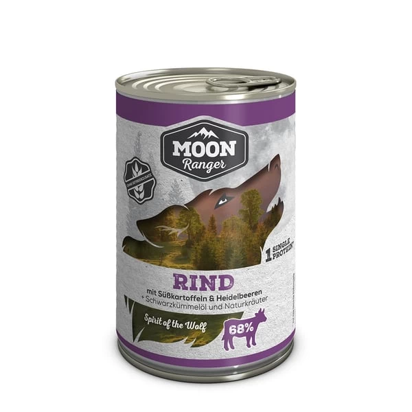 Wenn du ein getreidefreies Nassfutter für deinen Hund suchst, bist du jetzt fündig geworden. Hervorragendes Futter verspricht MOON Ranger Rind mit Süßkartoffeln & Heidelbeeren. Für MOON Ranger werden nur ausgewählte Zutaten verwendet. Die einzigartige und mit Tierärzten entwickelte Zusammensetzung enthält wertvolle Öle und Kräuter. So kommt sie dem Wolfskonzept so nahe. Überzeuge dich jetzt von dem Futter und gib deinem Hund den “Spirit of the Wolf”!