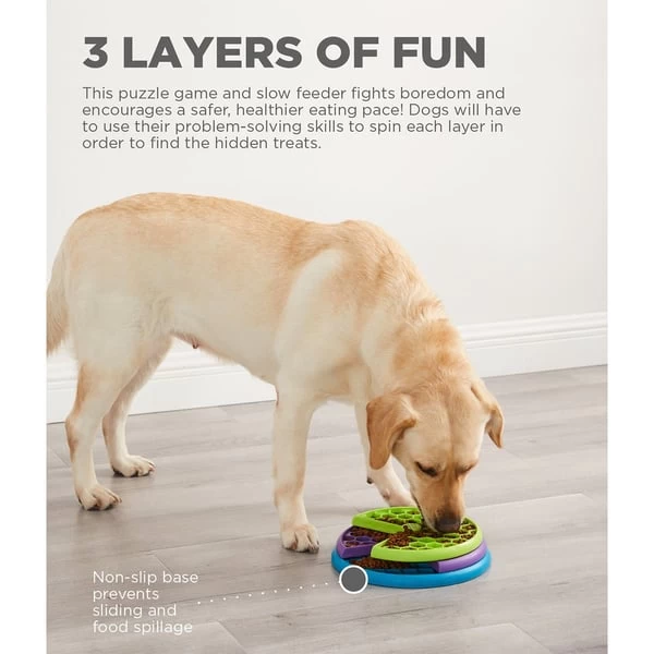 Lickin‘ Layers von Nina Ottosson by Outward Hound ist ein Hunde-Denkspielzeug mit Level 2. Die Hunde müssen drei Ebenen an Leckerlifächern bewältigen, indem sie jede davon drehen, um die Belohnung freizugeben. Denkspielzeuge für Hunde helfen den Vierbeinern, ihre natürlichen Instinkte und Verhaltensweisen einzusetzen, und unterstützten so durch geistige Anregung die Entwicklung des Gehirns. Spiele wie Lickin‘ Layers bieten ihnen die Stimulation, auf die sie so wild sind. Mit über 100 Leckerlifächern sorgt dieses Hunde-Denkspielzeug dafür, dass die Vierbeiner beschäftigt und aktiv bleiben. Es bietet außerdem genug Platz, um als Anti-Schling-Napf zu dienen. So können die Fütterungszeiten verlängert werden und dein Hund wird dazu gebracht, in einem langsameren und gesünderen Tempo zu fressen.