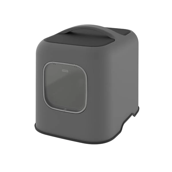 Die designorientierte Katzentoilette in zeitloser Gestalt. Der Kohlefilter im Deckel fängt unangenehme Gerüche auf und verhindert, dass diese nach Aussen gelangen. Durch einen Magneten lässt sich die Tür schnell schliessen und bleibt in geschlossener Position – eine weitere Eigenschaft, um schlechte Gerüche in der Katzentoilette zu bewahren. Eine Schaufel für die Reinigung der Katzentoilette ist inbegriffen. Der obere Teil der Katzentoilette lässt sich ganz einfach mit einer Hand entnehmen, was sie auch dank des ergonomischen Griffes sehr benutzerfreundlich macht. Das Produkt besteht aus rezykliertem Kunststoff.