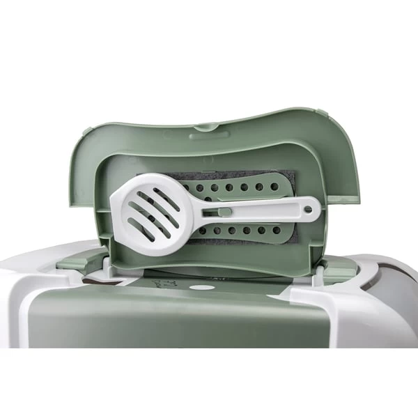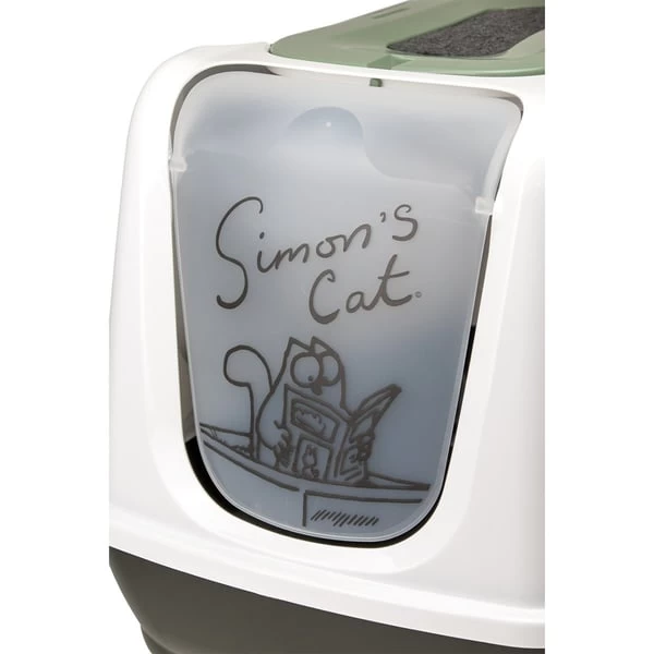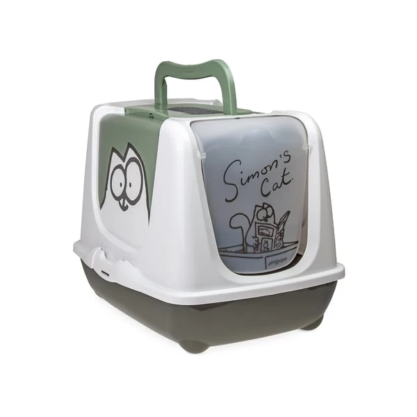 Für alle Fans der Zeichentrickfilme und Comics des britischen Animators und Illustrators Simon Tofield. Wer die Episoden aus dem Leben von Simon’s Cat liebt, bekommt hiermit eine Auswahl schöner Katzenartikel mit liebevoll ausgesuchten Motiven der bekannten Hauskatze in witzigen Posen und mit den typischen Grimassen. Zum Beispiel diese geschlossene Katzentoilette aus hochwertigem Kunststoff. Ober- und Unterseite können mit Hilfe von Clips miteinander verbunden werden. Ein integrierter Aktivkohlefilter im Deckel verhindert das Austreten von unangenehmen Gerüchen. Eine praktische Streuschaufel wird mitgeliefert und lässt sich im Deckel verstauen.