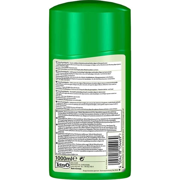 Tetra Pond AlgoFin* wirkt effektiv bei den häufigsten Algenarten, wie zum Beispiel Fadenalgen, Schwebe- und Schmieralgen. Der spezielle Wirkstoff greift gezielt in den Organismus und Stoffwechsel der Algen ein und hemmt somit die Fähigkeit, Photosynthese zu betreiben. Das vernichtet die Algen innerhalb von 2-3 Wochen. Außerdem wird weiterem Algenwachstum vorgebeugt. Tetra Pond AlgoFin ist geeignet für Zierteiche mit Fischen, Pflanzen und Mikroorganismen.