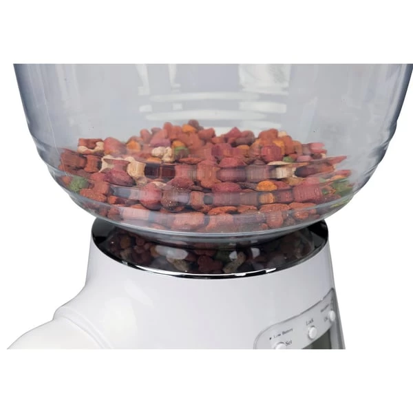 Der Futterautomat für Hunde und Katzen erlaubt Programmierungen der Fütterungszeiten bis zu 5-mal pro Tag und passt bis zu 5 Liter Trockenfutter – einfache Programmierung.