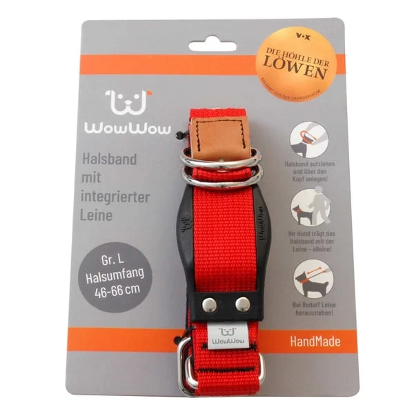WowWow Professional ist ein Hundehalsband, in dem eine ausziehbare Leine von ca. 60 cm integriert ist. Bei Bedarf kann die Leine gegriffen und herausgezogen werden. Nach Gebrauch verschwindet die Leine wieder im Halsband. Perfekt für Situationen, in denen kurzfristiges Anleinen des Hundes notwendig ist.