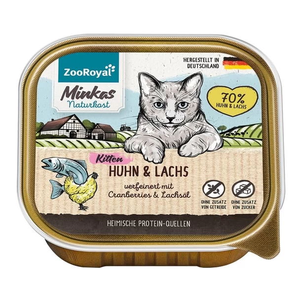 Entdecke schmackhaftes Nassfutter für deine Katze. Hochwertiges Futter ist dir mit ZooRoyal Minkas Naturkost Kitten Huhn & Lachs verfeinert mit Cranberries & Lachsöl garantiert. Das Futter ist für Katzen aller Größen zu empfehlen und speziell auf die Bedürfnisse von Kätzchen angepasst. Der erhöhte Energiebedarf von Katzen im Wachstum wird bei diesem speziellen Kittenfutter berücksichtigt. So wird dein kleiner Liebling bestens mit geeigneten Nährstoffen versorgt.